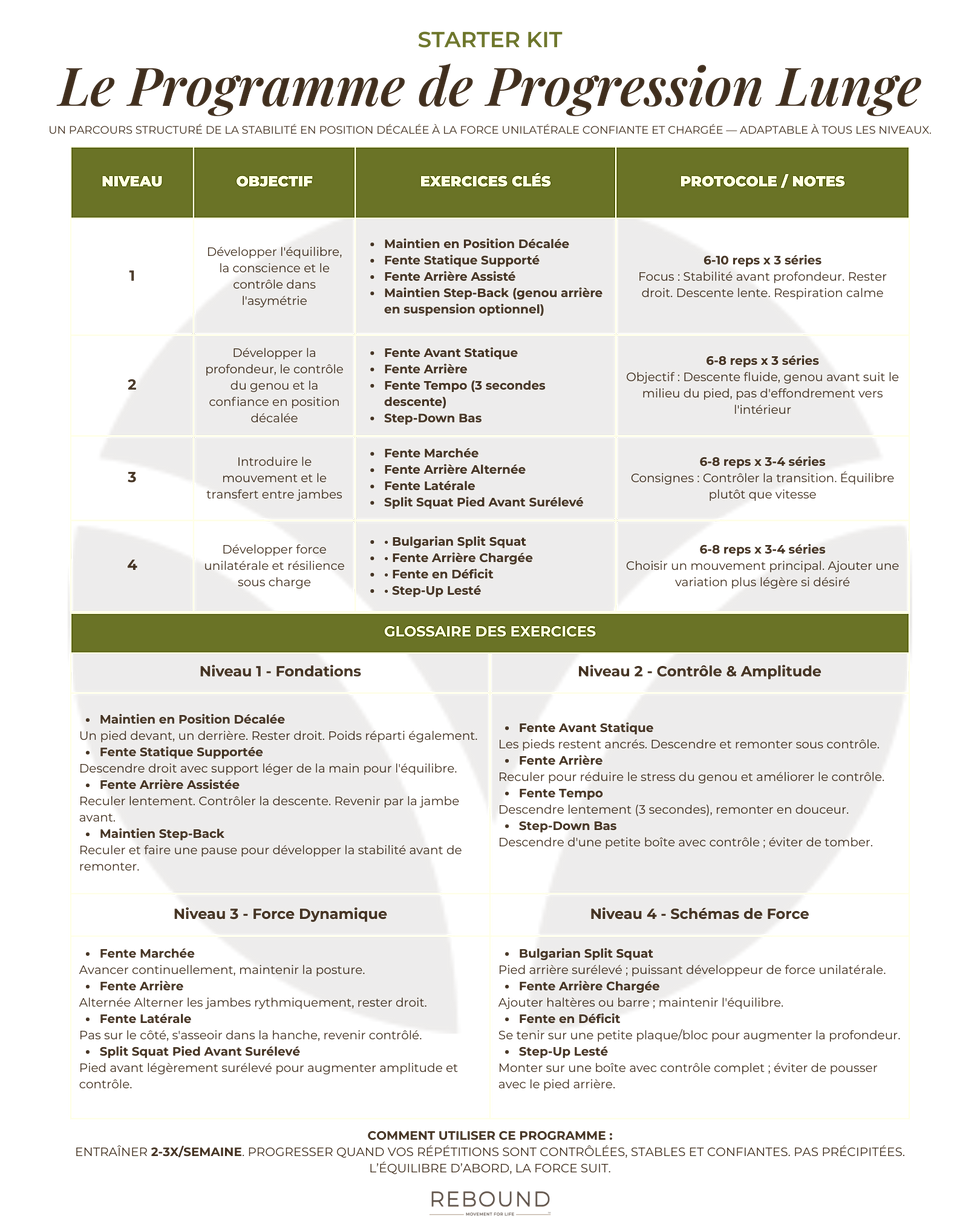 Comme le squat, le hinge, le push et le pull, le Programme de Progression Lunge vous guidera à travers :